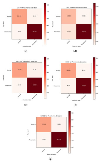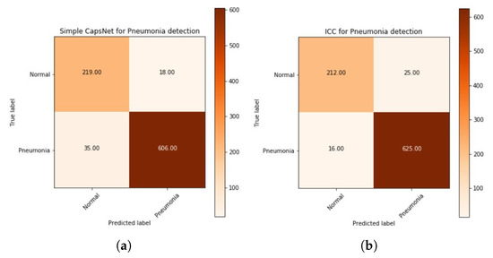 The plot of a confusion matrix for all three of the models whose training history has been mentioned earlier in Figure 10, Figure 11 and Figure 12 for simple CapsNet, ICC, and ECC, respectively, have been given in Figure 14. It can be observed that the simple CapsNet model (Figure 14a) has 35 false negatives (FNs) (5.46% of “Pneumonia” CXR images) from the CXR test set of 878 images. In pneumonia detection, FNs can prove to be fatal as someone who has pneumonia may be denied of its possibility and therefore, may get the wrong treatment for it. On the other hand, this model has 18 false positives (FPs) (7.59% of “Normal” CXR images), which have otherwise been normal CXR images predicted to have pneumonia.