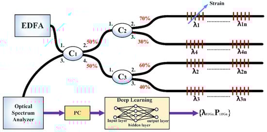 Figure 1 shows the experimental setup of the proposed IWDM-based FBG sensor network. The sensor network structure consists of an erbium-doped amplifier (EDFA), optical spectrum analyzer (OSA), optical coupler (C), a personal computer (PC), and FBGs. The EDFA emits the light. The EDFA is utilized to illuminate the FBG sensor array positioned in a parallel structure. The light produced from the EDFA is passed through a coupler (C1), then split into two divisions (i.e., C1 and C2), and fed into FBG sensors. Then, the reflected signals of FBGs are transmitted to the central office (CO) through the C1 coupler. The OSA, located in the CO, can detect and record the reflected spectra of FBGs. Finally, for additional data processing, the detected reflection spectra of the FBG sensors from OSA will be passed to a personal computer (PC). Thus, the PC is used to perform data preparation and to perform the simulation of the deep learning model for measuring the sensing signals of FBGs.
