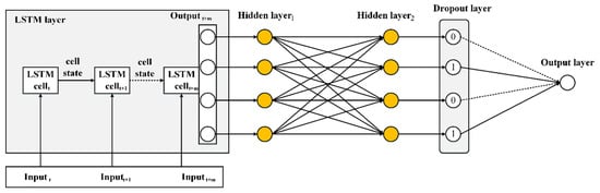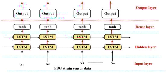 Figure 3 illustrates our proposed architectures of the LSTM algorithms. The first layer of the architecture of our proposed model consists of a layer of LSTM cells. This helps to collect the sensor reflection information about our sensor data throughout different strain sensor values. The LSTM model output may still have remaining nonlinearities; hence, we used two dense hidden layers to solve the distortions or nonlinearities. Then, we implemented a dropout layer to mitigate the risk of overfitting by regularizing the output. Finally, in order to obtain the optimal prediction, the output layer is set to structure the output of the model. Taking the benefit of LSTM in processing sequential data, the sensing signal detection problem is changed into a regression sequential data problem. As shown in Figure 3, the sensing signal detection is considered as a sequential learning problem. When the sequence of reflection spectra of FBGs X = { is given as an input, an LSTM-based sensing signal measurement model calculates the hidden value , and then the output value Z = { is calculated by the following: