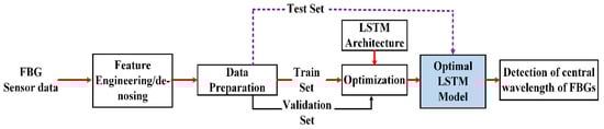 The rest of this paper is structured as follows: The operational principle of our proposed IWDM-based FBG sensor system and the proposed LSTM algorithm is described in Section 2. In Section 3, the experimental setup, data collection, data preprocessing, and design of our proposed LSTM model are presented. In Section 4, the test results and the discussion are presented. Finally, in Section 5, the conclusion is presented.
