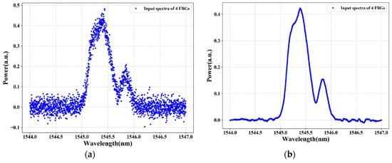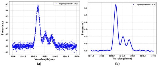 The spectra of four FBGs when two FBGs overlap: (a) before applying discrete waveform transform (DWT) and (b) after applying DWT.