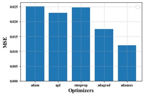 During the training of the LSTM, various parameters such as the number of epochs, batch sizes, hidden layers, hidden units, and optimizer and activation functions are adjusted until optimal values are obtained. Tuning all these parameters results in different training times, root mean square errors (RMSE), and mean square errors (MSE). To know the optimal optimizers, we train the model with distinct optimizers [32] and compare the performance based on MSE (see Figure 8).