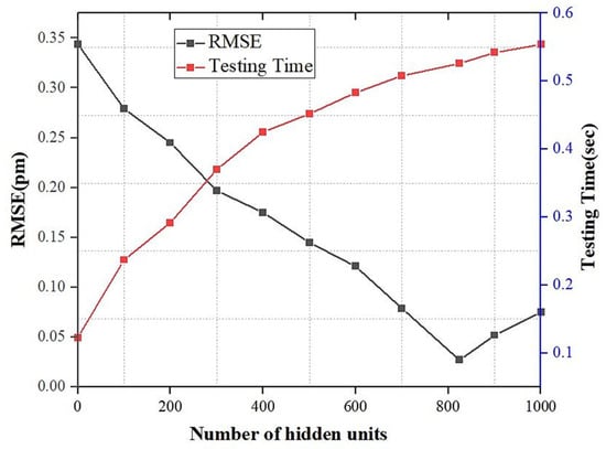 Moreover, to obtain the optimal model, we trained the LSTM model with a variety of hidden units to choose the best number of hidden units. The comparison of the LSTM models’ RMSE with various hidden unit numbers is shown in Figure 9. As shown in the figure, the RMS error decreases as the numbers of hidden units increases. However, when the number of hidden units increases, this requires more testing time. The number of hidden units is saturated, and the error increases after the 824th hidden unit. The maximum test time for the 824 hidden unit LSTM model is 0.526 s. Therefore, for the proposed LSTM model, the optimal hidden unit’s number is 824, which achieves both acceptable accuracy and test time.
