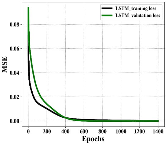 Moreover, Figure 10 shows the MSE variation of the training and validation losses of our proposed LSTM model with various epoch numbers. Both the training and validation losses reduce significantly with the increase of the epochs/iterations. When the epoch number exceeds 250, the training loss reduces slowly and the validation loss varies in the range of 0 pm to 0.014 pm. The training loss and validation loss converge quickly after approximately 800 iterations, while the optimum value is obtained at the 1400th iteration. The training and validation losses of LSTM are 0.003 and 0.0005 pm, respectively.