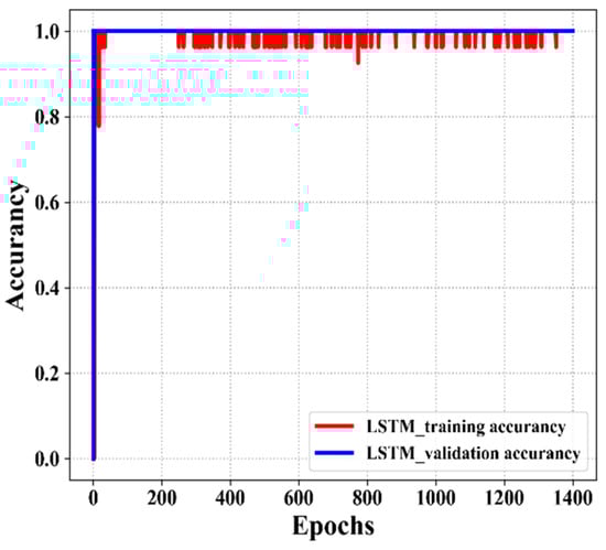 Figure 11 shows the training accuracy and validation accuracy of our proposed LSTM models with different epoch numbers. As shown in the figure, when the epoch number increases, the accuracy of the model also increases. Thus, at epoch 1400, the LSTM validation accuracy (blue color) achieves 100% accuracy and the LSTM training accuracy (red color) achieves 95% accuracy. Therefore, after several training computations, the optimal values are achieved using the following parameters: 824 hidden units, 1500 batch size, 1400 epochs, and four hidden layers for the well-trained LSTM model, which achieves an acceptable accuracy and testing time.