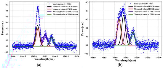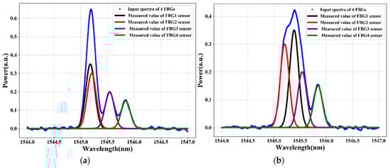 Therefore, the sensing signal measurement of FBGs can be rapidly determined by sequentially feeding the reflection spectra of FBGs into the well-strained LSTM model. As a result, the strain sensing signals output the results of the well-trained LSTM model for four distinctive test cases, as shown in Figure 12 and Figure 13. Figure 12a,b shows the sensing signal measurement output of our proposed LSTM model without using DWT data de-noising techniques when the spectra of two FBGs are overlapped (see Figure 12a) and of three FBGs are overlapped (see Figure 12b). As shown in Figure 12a, the proposed LSTM model can measure the sensing signals of FBGs without using de-noising techniques when the spectra of FBG1 and FBG2 are completely overlapped. As shown in Figure 12b, the proposed LSTM model measures the sensing signal of each FBG without using de-noising techniques when the spectra of the FBG1, FBG2, and FBG3 sensors are overlapped.