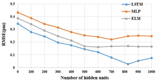 Furthermore, the comparison of the RMS error from the proposed LSTM models with the other two models based on hidden unit numbers variation is shown in Figure 15. As shown in the figure, the RMS error decreases as the numbers of hidden units increases and LSTM has better performance than the other two models. Our proposed LSTM model achieves a better result when the hidden unit is 824. Therefore, the LSTM-based strain sensing signal measurement method can improve the sensing signal measurement accuracy, speed, and the number of FBG sensors even in bad or noisy environments.
