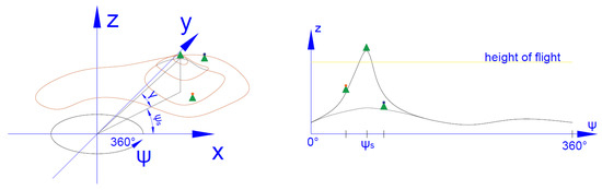 In order to determine the possibility of SAR observation of the object from a given direction of flight, it should be checked that the straight line connecting the observed target with the UAV will not be hidden along the entire route by an obstacle between the target and the UAV. For this purpose, a histogram of elevation is created in the reference coordinates system of the observed object for a distance from the UAV to the recognized target (see Algorithm 2). Then, it is possible to prepare data showing the minimum UAV elevation allowing observation of the object from this angle (see Figure 4).
