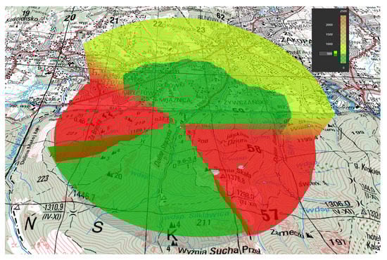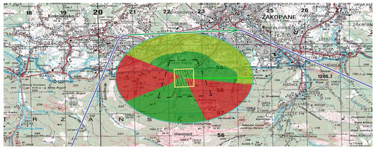 An example of LoS calculation is shown in Figure 5. The target for recognition is located in the center of the area. The area marked in green indicates places where the target is visible to UAV flying at least 500 m above sea level. The area marked in orange indicates places where the target is visible to UAV flying at least 2000 m above sea level. Flying over the area marked in red will not allow the UAV to recognize the target.