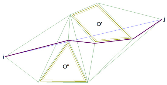 For each of the above types of targets, which will be recognized using a given type of sensor, one must determine the UAV flight segment modeled using the arc ( i , j ) E of the network S . The UAV flight segment in the neighborhood of the recognized target must be located at the optimal distance for reconnaissance. The ( i , j ) network arc, describing the UAV flight route near the target destination, has got predefined parameters that affect the recognition order. These are the priority of target r R recognition p r and the required recognition time (given in the form of the time window [ e r , d r ] , where e r is the earliest date of ISR (Intelligence, Surveillance and Reconnaissance) tasks for the r-th target, and d r is the due date of ISR tasks for the r-th target.