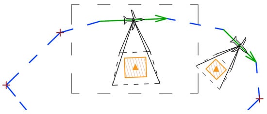 The use of SAR radar to recognize the targets forces the location of the UAV flight route, so that the UAV flight segment has the length of L A and a distance is within the specified distance R from the target, and the UAV moves within the specified distance l δ c r from the recognized destination, where l m i n δ c r l δ c r l m a x δ c r from target. The values l m i n δ c r and l m a x δ c r depend on the SAR cross range resolution and type of the SAR radar. It is specific for a producer. The process of determining the location of the UAV flight segment is strictly dependent on the sensor used and its integration with the UAV and the sensor construction. An example of route segment planned, taking into account the SAR sensor requirements, with marked beam size, is shown in Figure 3.