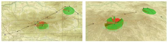 Figure 8 and Figure 9 present two example plans for missions with SAR usage (presented in Luciad LightSpeed Geographic Information System; maps from http://wcg.wp.mil.pl). Each image was marked with line of sight cone enabling correct data acquisition.