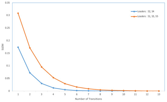 Equation (19) indicates that the SLEM of any transition matrix is a number that is strictly less than one. The magnitude of is inversely proportional to the rate of convergence in the leader-follower network.