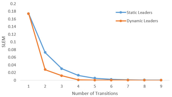 Figure 8b represents the network when the mobile leaders of and switch their locations. Leaders were selected according to the principles of leader selection, which were discussed earlier in this work. The SLEM for this network equals one.