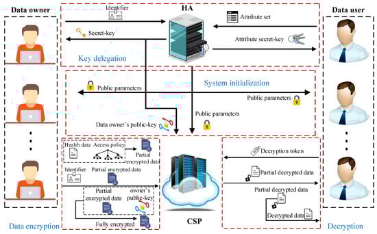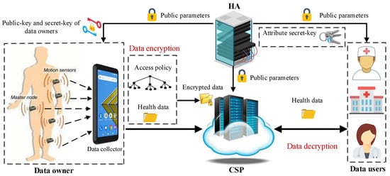 - CSP: The CSP has almost unlimited computational and storage resources. Its primary responsibility is to provide storage and computational services. When data owners want to encrypt their collected data, they can outsource most of the computational operations of the encryption phase to the CSP. Moreover, data users can also use the CSP’s computational services. When a data user retrieves an encrypted health data, the CSP can help it to recover the associated data by performing most of the heavy computations of the decryption phase without learning any partial information about the underlying health data.