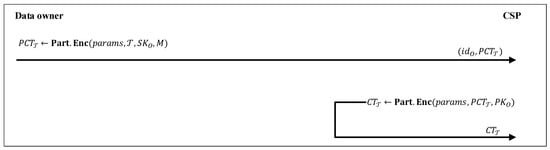 - : The CSP runs this algorithm. This algorithm takes the public parameters , a partial ciphertext , and a data owner’s public-key . It outputs a ciphertext .