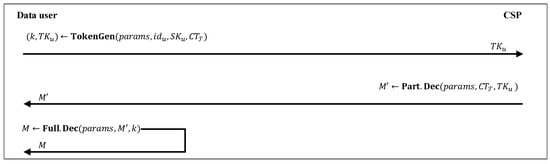 - : A data user operates this algorithm. On input the public parameters , the partial decrypted ciphertext , and its associated private-key k, this algorithm returns the message associated with .