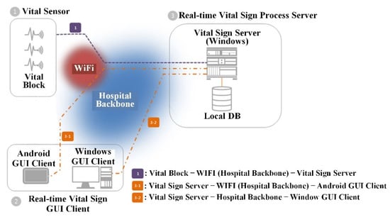 The proposed portable u-Vital system introduced in the study mainly consists of a Vital Block (VB) (which is a small patient monitoring device (PMD) that is capable of obtaining patient vital signs in real-time) and Vital Sign Server (VSS) (which transmits, analyzes, and manages the data wirelessly). The VSS creates a database including patient vital signs, performs long-term analysis of vital signs, and ensures that the patient records are secure through a database lock. A VB continuously monitors patient vital signs in the ward and recovery room or measures changes in the patient’s condition during medical procedures in the emergency room and operating room. Additionally, it sends measured vital sign data to smart devices or central monitoring system. The vital sign data transmitted to a VSS can be analyzed to aid clinicians in assessing the patient’s condition and performing appropriate treatment. In case a patient’s condition is continuously recorded, such as in a gastrointestinal endoscopy center or an artificial kidney room, it can aid in patient care by eliminating the labor-intensive work of medical staff.