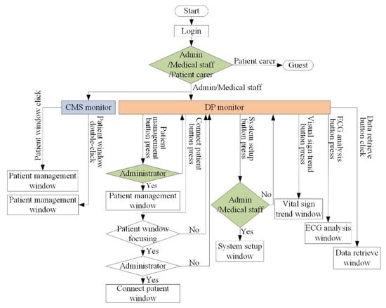 The developed application consists of a central monitoring system (CMS) program in the VSS and viewer program in the Android smart device. The CMS program uses dual-monitors. The main-monitor is used for the central monitoring of transmitted bio-signals and the sub-monitor is used for data processing (DP). An overview of the user flow diagram for the dual-screen configuration of the CMS program is shown in Figure 2. Among the subscribed users, administrators and medical staff can access the CMS and DP screens. On the CMS screen, a patient window with measured bio-signals of each patient is observed. Additionally, trends and analyses of collected bio-signals (especially for ECGs) are seen on the DP screen.