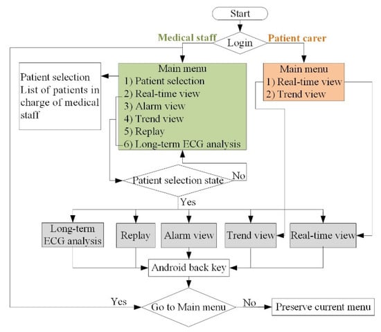 Figure 3 shows the user flow diagram of the viewer program in an Android smart device. If the logged-in user is a patient carer, only two menus (Real-time view and Trend view) are available for providing basic bio-signal information measured for the patient. Conversely, if the logged-in user corresponds to a medical staff, six menus (Patient selection, Real-time view, Alarm view, Replay, Trend view, Long-term ECG analysis) can be selected.