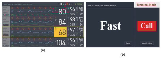 As mentioned above, the server program is divided into the CMS program and DP program. First, as shown in Figure 4 the CMS program includes a patient window in the center of the screen where information for up to 32 patients can be viewed in real time. There are multiple patient windows on a page with multiple split screens. The user can double-click on the patient window of interest to view more detailed information on the DP monitor. The user can also check the connection status with an icon in the toolbar at the top of the screen. A patient window supports two modes, patient monitor (PM) mode and patient data terminal (PDT) mode, and one of the modes is displayed on the screen based on the mode set in the corresponding VB. As shown in Figure 4a, the PM mode receives bio-signals, such as ECG, measured in the VB from the server and displays them in real-time. The PDT mode is used to receive information from the VB via the VSS or to provide information to the VB. The PDT mode displays the patient name, VB equipment name, room name, and bed number registered in the current patient window at the top left of the screen, as shown in Figure 4b, and transmits the information that the user wants from the VB to the VSS.