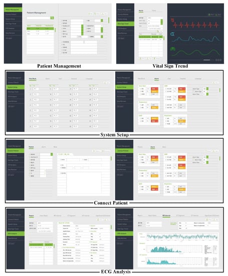 The DP program includes several functions (Patient Management, Connect Patient, System Setup, Vital Sign Trend, ECG Analysis, and Data Retrieve), as shown in Figure 5. First, the Patient Management menu can search for registered patients or select a specific patient among the searched patients. The Connect Patient menu consists of Patient, Alarm, and Wave sub-menus. Basic information on the patient is displayed in the Patient sub-menu. In the Alarm sub-menu, when the patient window of the connected patient is selected on the CMS monitor screen, the alarm information (upper and lower limits of HR, NiBP, BT, SpO2, and RR) of the corresponding VB is initially set in each item of the screen. The System Setup menu is configured by receiving the IDs of all VBs from the VSS and consists of VB, Alarm, User, Hospital, and Language sub-menus. The Alarm sub-menu among the sub-menus is initially configured by receiving existing alarm information from the VSS. The User sub-menu can search for registered users or select a specific user from the searched list. The Hospital sub-menu receives and configures all hospital information from the VSS. The Vital Sign Trend menu consists of the Alarm and Trend sub-menus. In the Alarm sub-menu, if a user enters patient information and a search term, then alarm lists corresponding to the conditions appear in the list below. When a specific alarm among the searched alarm lists is selected, the vital signals at the time before and after the corresponding alarm is generated are displayed as a chart on the right side of the screen. In the Trend sub-menu, when patient information and search period are entered, bio-signal information corresponding to the conditions is displayed at the bottom of the screen. The ECG Analysis menu consists of Report, Heart Rates, RR Interval, ST-Segment, QT-Interval, and Significant ECG sub-menu. In the Report sub-menu, if the patient information and the search term are entered, then the use-list of the VB corresponding to the condition is searched. When a specific item among the searched lists is selected, an ECG analysis result for the data is displayed. The Heart Rates sub-menu calculates minimum, maximum, and average HR for the retrieved ECG data, and the retrieved ECG data is displayed at the bottom. The RR Interval sub-menu calculates the RR interval of the selected ECG data to estimate tachycardia, bradycardia, histogram, and FFT spectrum. The Significant ECG Event sub-menu displays the time zone in which arrhythmia occurred for the selected ECG data. When a specific time zone is selected, ECG data including the corresponding arrhythmia is displayed.