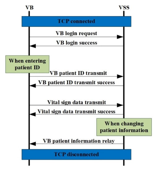 Figure 7 shows the flow chart based on the usage scenario between the VB and VSS. The usage scenario represents a network flow diagram from the VB login request to the measured data transfer of the VB. The general usage scenarios are as follows. First, the VSS opens listen socket on port 9999 and listens (waits) for the connection request. Additionally, the VB requests a TCP-based connection to the listening port of the VSS. The VB requests a login to the VSS after the TCP connection is successfully accepted. After the login request of the VB is successfully processed in the VSS, the VSS responds to the VB that the login request was successful. Following a successful login request, the VB sends the patient ID entered by a medical staff to the VSS. When the patient ID is normally received and processed in the VSS, the VSS accepts a successful login request to the VB. After the login request and the patient ID transmission to be measured are successful, the VB transmits the measured bio-data to the VSS based on a predetermined cycle (The bio-data transmission/reception time between the VP and VSS = 0.5 s). The VSS responds with a successful data transfer to the VB after the measured data of the VB is normally sent to the VSS. As the vital sign measurement devices continue the measurement activity, the data transfer from the VB to the VSS and success response from VSS to the VB are repeatedly performed. When the VB is logged in and the patient to be measured is set, the VSS relays the measured data to the logged-in PC and tablet PC (or smart device) client. Among the specific VBs that are logged in, the VBs that are disconnected (socket disconnect) from the network are logged out. It is noted that when a patient’s information changes (such as room number or bed position), the VSS forwards the modified patient information to the VB associated with the patient ID.