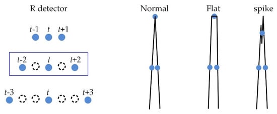 In typical ECG signals, the QRS complex is narrow and high while the P or T waves are gentle. Therefore, the detector to detect only the R-point in the P and T wave should consider the characteristics of the R wave. The proposed R point detector is designed to exhibit a similar detection performance for R waves with normal, flat, and spike peaks, as shown in Figure 8.