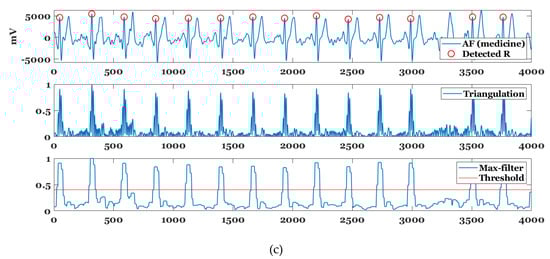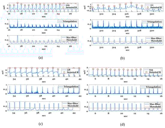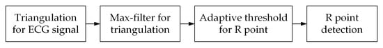 Figure 9 shows the block diagram for the proposed R-point detection method. The proposed method applies a max-filter to (normalized) the triangulation values for an original ECG signal to enhance the R-wave interval. The max filter defines a candidate interval of the R-point detection for the enhanced R wave by the triangulation processing. The size of the max filter used for MIT-BIH arrhythmia database (360 samples/sec) [40] is 1 × 25 sample interval. Thereafter, the adaptive threshold is applied to the sliding window to detect a section in which the R-point exists. The size of the sliding window and step size were set to 4000 and 500 samples respectively based on MIT-BIH arrhythmia database. The adaptive threshold is defined as the average of the top 40% of the max-filtered values for triangulation values sorted in descending order relative to the sliding window. Subsequently, if the maximum value in each R-point presence interval exceeds the average of the sample points of the sliding window, then it is detected as an R-point. Otherwise, the minimum value is detected as an R-point for negative R-point such as premature ventricular contraction (PVC).