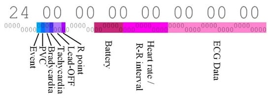 Many patient monitoring systems currently use different data formats, making medical data less compatible. Therefore, standardization of medical data is urgent as mentioned Section 2. The developed system also uses the data format we defined. Figure 13 shows an example of the data format of the proposed u-Vital system. One bit is assigned to Event, PVC, Bradycardia, Tachycardia, and R point flags, and 2 bits are assigned to Lead-off. In addition, 7 bits for battery information, 11 bits for heartrate and RR interval, and 24 bits for ECG data are allocated.