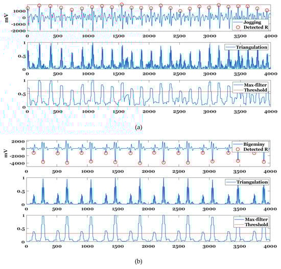 R-point detection results for (a) jogging, (b) ventricular bigeminy, and (c) atrial fibrillation (AF) electrocardiogram (ECG) signals.