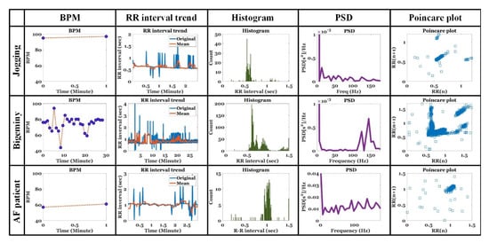 Figure 15 shows the HRV analysis of the jogging signal for 2 min 30 s, ventricular bigeminy signal for 30 min, and AF signal for 3 min. The analyzed HRV included beat per minute (BPM) and trend, histogram, and power spectral density (PSD), and poincare plot for RR interval.
