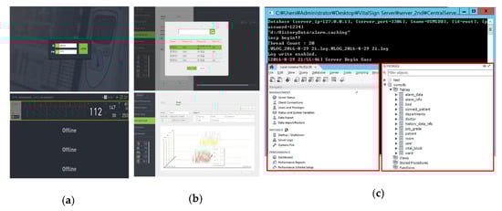 First, we verified whether the vital sign viewer program was working properly. The login was performed by running the GUI that can connect to the VSS system, as shown in Figure 17a. By choosing the specific patient window, the patient currently monitored by the VB was connected. It was confirmed that the measured bio-signals were displayed normally in the Patient Window of the connected patient. In the vital sign viewer GUI, the patient for viewing the vital sign trend graph was selected. It was verified whether the information to be verified among the bio-signal information of the chosen patient is displayed on the vital sign viewer. As shown in Figure 17b, when entering the vital sign trend menu, the patient to be searched is selected through the patient selection popup. Additionally, the Trend sub-menu on the upper tab was selected, and the period and bio-signals to be searched were set on the displayed screen. To verify the DBMS access using MySQL, it was verified that the MySQL server and MySQL database script were installed after running the VSS system. Additionally, as shown in Figure 17c, the server start message (Server Begin Succ) is confirmed after running the VSS. The VSS executes a query to obtain the VB list when it is executed. By running the MySQL workbench program, the table and trigger configuration of the database was verified.