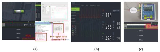 It was verified whether real-time bio-signal data is output from the vital sign. As shown in Figure 18a, a patient for connecting to monitor real-time data is connected and the real-time bio-signal data of the connected patient was displayed. The measured bio-signal data was also stored in the directory set up in the VSS’s configuration (ServerConfig.ini file in the figure). As shown in Figure 18b, the DP screen displays the detailed patient window for the patient’s bio-signal data. In order to verify the arrhythmia detection alarm function, the ECG signal generation simulator (Contec MS-400 [41]) was connected to the VB. Subsequently, an arrhythmia signal was generated in the simulator. If an unusual (arrhythmia suspicious) waveform was detected, the arrhythmia detection and alarm were verified in the vital sign viewer of the VSS system. Figure 18c shows an arrhythmia detection scene using the ECG simulator. The dummy VB transmits virtual measurement data upon successful login to the VSS. An arrhythmia waveform was generated through the ECG simulator linked to the VB. The data loaded by the dummy VB contained an arrhythmia waveform, and it was verified as to whether the alarm was generated for the arrhythmia waveform. The alarm was displayed in the graph area where the ECG Lead data was displayed. The interlocking experiment of the VSS and VB verified that vital sign information measured from each patient was transmitted in real-time through the VB, and the transmitted vital sign information was stored and analyzed in real-time on the server.