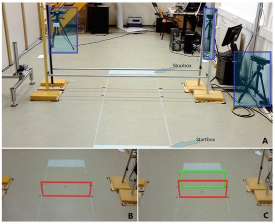 (A): Real obstacle with two hurdles (height 0.4 m, depth 0.3 m). White start and stop boxes projected onto the floor marked the beginning and end of the walking path. The three Kinect v2 sensors are highlighted with shaded boxes. (B): Holographic obstacle with one hurdle (height 0.4 m, depth 0.02 m). (C): Holographic obstacle with two hurdles (height 0.4 m, depth 0.3 m).