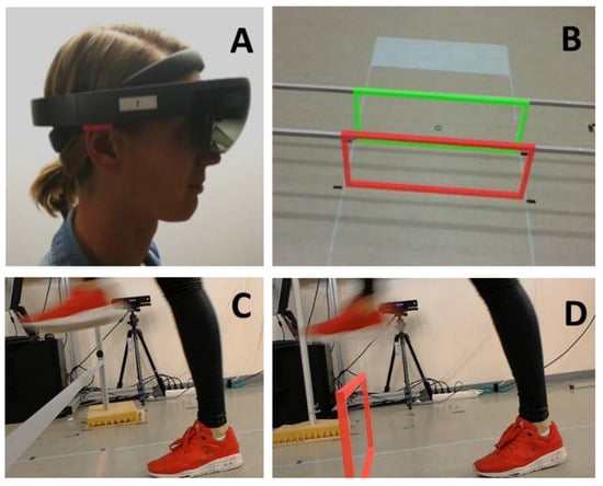 The real obstacles consisted of one or two horizontal hurdles made of aluminum bars held with magnets that could be fastened at different heights, as shown in Figure 1A. The bars dropped when touched. Holographic obstacles were presented with a HoloLens (Figure 2A; Developer version 1.0: https://www.windowscentral.com/hololens-hardware-specs) and consisted of one or two holographic hurdles, with the colors red and green (Figure 1B,C). A custom-made HoloLens application was built using the Unity3D 2017.3 engine for presenting these obstacles. The frame rate was 60 frames per second to ensure that the holograms and the matching coordinate system of the headset were in sync. The resolution per eye was set to 1268 × 720 pixels. Since the relatively small augmentable FOV of the HoloLens may preclude the full display of large holographic obstacles, holographic hurdles were preferred over solid 3D holographic obstacles to improve the interpretability of the obstacle’s dimensions and its location with respect to the ground. It is important to note that the holographic obstacles were placed using a spatial anchor, i.e., a local little map of the environment, to ensure that a hologram remained exactly at a specific spot in the real world. Furthermore, spatial anchors were persistent over time, which ensured that holographic obstacles were presented at the same location across participants and conditions. Since the HoloLens display has a fixed focal length of approximately 2.0 m, we set the distance between the first hurdle and the start box (1.2 m) such that the holographic hurdle was optimally viewed at a distance of about 2.0 m (assuming a HoloLens height of 1.75 m and an average obstacle height of 0.2 m). Moreover, at this distance from the start box, the holographic obstacle was fully in view, with a stable location on the floor. Before starting with the holographic obstacles block of trials, the pupillary distance was determined with the ‘HoloLens calibration’ app, while basic hand gestures were learned with the app ‘Learn gestures’ to enable interaction in mixed reality. Thereafter, participants played the game ‘Roboraid’ for at least 10 minutes to get used to the HoloLens. Finally, a holographic obstacle was projected together with a real obstacle of equal height and depth (Figure 2B) to check whether the holographic obstacle was perceived at the correct location, as set with the spatial anchor. All participants reported a visual overlap of real and holographic obstacles. The total duration of wearing the HoloLens before starting the measurements was approximately 30 minutes.
