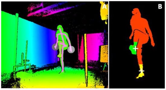 (A): Mirrored depth image from Kinect Studio with a superimposed stick figure based on the 25 body points of a participant avoiding a 3D holographic obstacle. (B): Extracted point clouds (mirrored) of left (yellow) and right (green) feet to determine step height and foot clearance with respect to the obstacle.