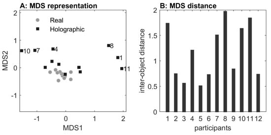 Multidimensional scaling (MDS) representation of obstacle-type conditions for each participant, derived from step heights and foot clearances of hurdle 1 and 2 for both feet (panel (A)). Each dot represents a participant, for real (gray) and holographic (black) obstacle conditions. Greater distances from the gray cluster of real obstacles is indicative of dissimilar holographic avoidance responses, as observed for participants 1, 8, and 11, and 4, 7, and 10 (cf. black squares labeled with participant number). Panel (B) shows the derived distance between each pair of real and holographic crossings for each participant.