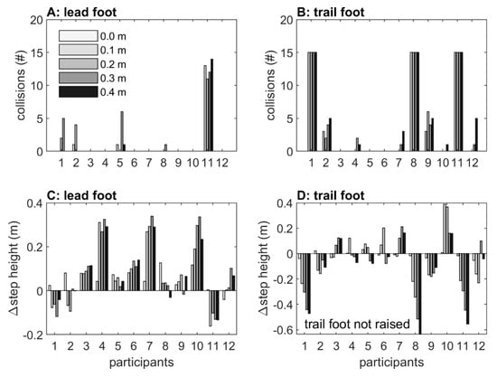 For real obstacles, we observed just a single collision for the trail foot at hurdle 2 with 0.4 m height. For holographic obstacles, substantially more collisions were observed. In Figure 5A,B, the distribution of collisions with the lead and trail foot at holographic hurdle 1 and 2 is depicted. A total of 39 (6.5% of the trials) and 32 (10.7%) lead-foot collisions were observed for holographic hurdles 1 and 2, respectively, which were for the most part caused by participant 11 (32 and 18 collisions, respectively; Figure 5A). For the trail foot, a total of 143 (21.7%) and 84 (28%) collisions were observed with holographic hurdles 1 and 2, respectively, mainly resulting from participants 1, 8, and 11, who always touched the holographic hurdle(s) (60 collisions per participant; Figure 5B). The remaining 21 lead and 47 trail-foot collisions mainly occurred for higher obstacles (0 m: 0, 0.1 m: 8, 0.2 m: 14, 0.3 m: 24, 0.4 m: 22). Since participants 1, 8, and 11 were also identified in the MDS representation as participants with a dissimilar holographic obstacle-avoidance maneuver, we decided to exclude them from further statistical analyses of trail foot outcomes because, in contrast to the other nine participants, they did not adjust their trail foot to holographic obstacles with heights 0.1 to 0.4 m (see also Figure 5D).