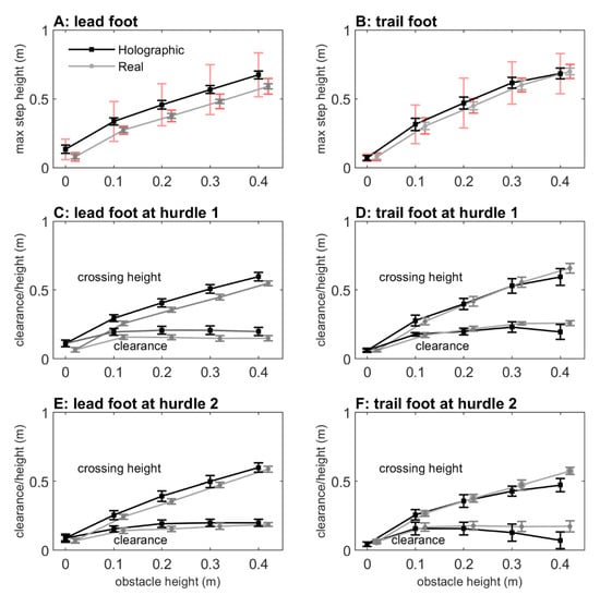 Maximum step height for lead (panel A) and trail foot (panel B), including indications of the within-subject (gray and black) and between-subject standard deviation (red; much greater for holographic than real obstacles). The crossing height and foot clearance at hurdle 1 for lead (panel C) and trail foot (panel D), including indications of within-subject variability (gray and black). Likewise at hurdle 2 (panels E and F). Note that participants 1, 8, and 11, who did not raise their trail foot for holographic obstacles, were excluded from panels B, D, and F.
