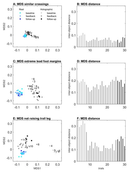 In Figure 7, an MDS representation of the effect of mixed-reality video feedback is depicted for real and holographic obstacle-avoidance trials (trials 3 to 30, color-coded for baseline, feedback, and follow-up trials), derived from the clearance and maximum step height of both feet for the three subgroups of participants with either similar crossing maneuvers for real and holographic obstacles or dissimilar crossing maneuvers (i.e., extreme lead-foot margins or not raising the trail foot with holographic obstacles), as identified in Experiment 1. For all subgroups, the distances between all real obstacle crossings were small, indicating similarity for real obstacle-avoidance maneuvers among the baseline, feedback, and follow-up trials. However, for holographic obstacle-avoidance trials, there appeared to be a difference between the five baseline trials (trials 3 to 7), the feedback trials (trials 8 to 25), and the follow-up trials (trials 26 to 30), particularly so for participants 1, 8, and 11 without trail-foot adjustments (Panel E) and only slightly so for participants 4, 7, and 10 with extreme lead-foot crossing margins (Panel C), and not for the participants with similar crossing maneuvers for real and holographic obstacles (Panel A). Mixed-reality video feedback was quite powerful, in that trial 8 (the first trial after first receiving video feedback) already seemed to deviate somewhat from the cluster of baseline trials, suggesting that participants quickly adjusted dissimilar maneuvers (particularly the participants not raising their trail foot) in the course of mixed-reality feedback trials. This was substantiated by the distances between individual holographic obstacle trials and the average over all real obstacle trials (Panels B, D, and F), which quickly changed from trial 8 onwards for participants not raising their trail foot (Panel F). Furthermore, the MDS representation suggests that the effects induced by video feedback were largely retained in follow-up trials without feedback (trials 26–30), especially so for participants without trail-foot adjustments (Panels E and F).