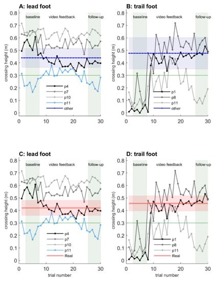 Crossing heights for lead (A and C) and trail (B and D) foot at holographic hurdle 1 (0.3 m height, marked as horizontal green line), focusing on the participants identified in Experiment 1 with dissimilar crossing maneuvers between real and holographic obstacles (Panels A and C: participants 4, 7, and 11 with extreme lead-foot margins; Panels B and D: participants 1, 8, and 11 without trail foot adjustments). The baseline and follow-up blocks of trials are marked by transparent gray boxes. Trial 8 is the first trial after the participant viewed mixed-reality video feedback. Trial 1 and 2 are familiarization trials. The blue transparent patches (Panels A and B) represent the 95% confidence interval of all trials of the nine participants with similar crossing maneuvers for real and holographic obstacles. The red transparent patches (in Panels C and D) represent the 95% confidence interval of all 30 real obstacle-avoidance trials of the three participants identified with dissimilar crossing maneuvers between real and holographic obstacles. Individual data falling outside these bands may be considered to deviate from, respectively, holographic obstacle crossing heights for participants with similar crossing maneuvers for real and holographic obstacles (blue band) and the real obstacle crossing heights for the participants identified with dissimilar crossing maneuvers between real and holographic obstacles (red band).