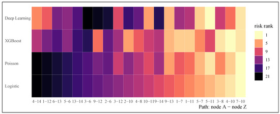 Figure 1 presents the concordance results with the logistic regression model used as a benchmark. As risk rank goes higher (the color of the tiles gets darker), the risk of events rises. The results show a higher concordance of prediction among the statistical models as well as among the machine learning models. There is less concordance across the statistical and machine learning models, for example, the highest risk paths (4–14, 1–12, and 6–13) predicted by statistical models are predicted to rank between 10 and 15 for the machine learning models.