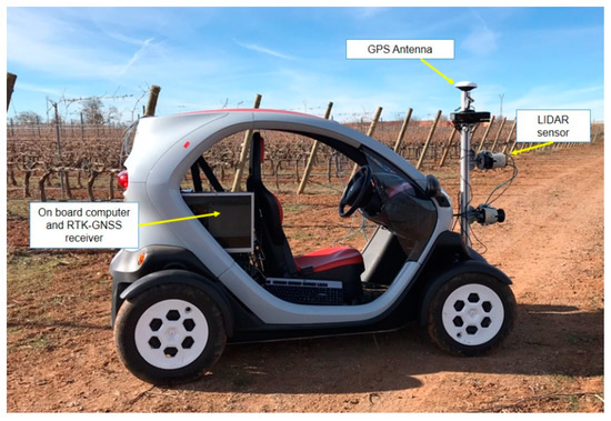 Readings were taken using a mobile platform based on a Twizy Urban 80 model (Renault), which is a plug-in electric vehicle. Sensors were installed on a height-adjustable instrument boom attached to the front of the platform (Figure 1). This mobile platform allows very low speeds, below 3 km/h−1, which is a key factor to acquire high-quality information, since data resolution is significantly affected by the speed of the mobile platform. The mobile platform comprised the following instrumentation: