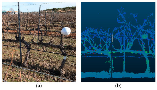 To properly obtain branch (vine shoot) volume, it is fundamental to accurately represent the 3D point cloud in order to assess its key geometric features. The output data from MATLAB can be visualized in the form of a 3D point cloud using Cloud Compare (CloudCompare 2.9.1 GNU License, Paris, France). The data comprise a matrix whose dimension is three columns (x, y, and z) and n rows where n is the number of scans. The scanned rows were marked out with physical references to assess and extract the geometrical features of 10-vine batches (Figure 2a). In order to eliminate those points that did not belong to the vine shoots (either they appear isolated or represent the stump, cordon, or the soil), they were delimited in the point cloud representation by manually projecting a cross-section (within the XY-plane) set at the average height of the buds (Figure 2b). Training structures were later removed by subtracting their volume from the totality (horizontal wires were discarded as they have a negligible effect in the volume calculations). Finally, data points that were considered outliers (those whose average distance to its 64 neighbors is greater than the standard deviation of the distance to the neighbors of all the points) were removed automatically from the point cloud using [23]. After filtering, the output data represented only the vine shoot geometry for every 10-vine batch.