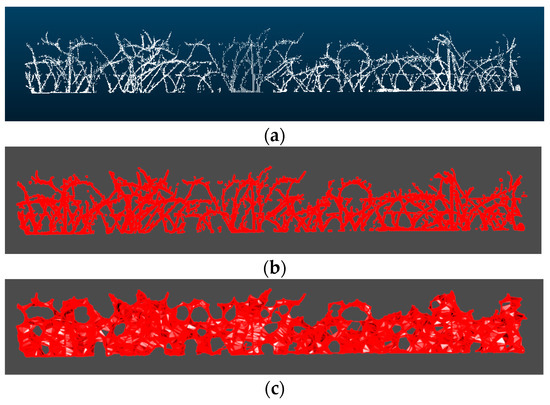 The resulting point clouds representing the vine shoots were strictly woody structures, since at that maturity stage, there were no leaves due to the winter season. Although point clouds were already filtered, discarding points out of the study area, branch volume cannot be directly calculated since it turns into a 3D solid clusters that encloses a volume (Figure 3). For that purpose, the alpha-shape (α-shape onwards) algorithm [24] was employed, as it had a proper performance in other studies in agriculture [14,25,26].To obtain the 3D object surface, and therefore, to be able to calculate the volume enclosed by this surface, a suitable alpha shape was generated as an outline that envelops the outer points of the point cloud. The degree of fit is defined by the index α. The more the α value decreases, the tighter the outline fits the points, producing a smaller surface to enclose a set of 3D points (loose shapes correspond to high α values). The most suitable α index would be the one that encloses the smallest volume whilst maintaining a solid surface free from voids. To calculate the α-shape of the branches of each section, thus to compute the volume enclosed, a 3D algorithm available in the alphashape3d package from R [27] based on the original work of [24] was used.