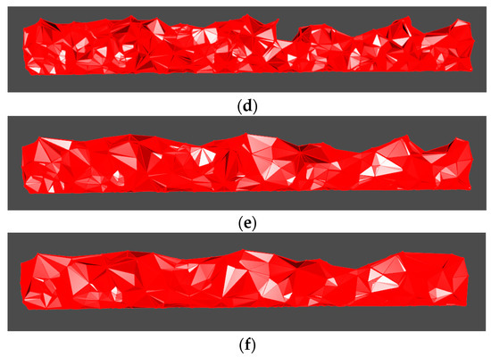 (a) Scanned point cloud of the branches of a section, (b) Alpha shape of the point cloud showed in (a) with alpha = 0.1, (c) with alpha = 0.3, (d) with alpha = 0.5, (e) with alpha = 0.7, and (f) with alpha = 0.9.
