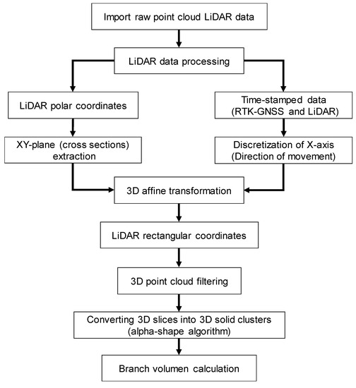LiDAR raw data was pre-processed using the RTK-GNSS receiver information for the discretization of the X-axis (direction of movement). In this way, vertical slices (cross-sections of the vines) of the areas studied were obtained within the ZY-plane, calculated branch volume, and compared to ground truth-values (plant dry biomass). It was necessary to pre-process the data as a prerequisite for calculating branch volume, since LiDAR densely sample the structure of the vines, producing massive datasets along with the high complexity of its data. LiDAR data provide a 3D representation of the vine canopy, which can be processed in multiples forms, offering a wide range of measurements from the same original raw data. Key traits that are relevant in phenotyping and plant physiological structure: ground cover and above-ground biomass (focusing on vine shoot volume) were extracted. The pre-process of the voluminous LIDAR raw data was performed using a Matlab R2017b (MathWorks, Natick, MA, USA) algorithm described in [16]. Laser scans were converted from polar coordinates (angles and distances) to rectangular (Cartesian) coordinates using a horizontal reference direction. For this purpose, data were transformed according to the angles of roll, pitch, and yaw to integrate the scans from LiDAR into the mobile platform coordinate system. After applying a 3D affine transformation, next, a translation was performed by shearing along over the X-axis (the direction of movement) for the actual LiDAR orientation. For this purpose, RTK-GNSS data and LiDAR data were time-stamped to adjust the actual orientation of the LiDAR. According to this approach, the local LiDAR point cloud was converted into a relative coordinate system, since NMEA data from the RTK-GNSS were used as an encoder for the vehicle advance. Therefore, homogeneous coordinates were obtained for the subsequent 3D calculations.