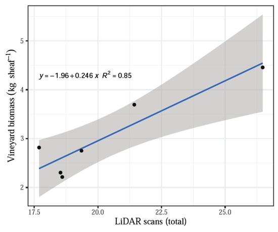 The number of scans by LiDAR influenced the relationship with the actual biomass measurements and had a significant effect on treatments. The remaining parameters assessed by the system, namely, shoot volume and shoot volume without the tutoring prob, did not have a significant effect when contrasted with the actual biomass dry weights (p > 0.05). The linear regression model fitted well all data (averaged by treatment) for the total LiDAR scans compared with the vineyard dry biomass, indicating that the increasing number of scans corresponded to the increasing biomass values with an R2 = 0.85 (Figure 5). In addition, a positive linear fit was obtained for the comparison between actual dry biomass and LiDAR volume, both total volume and volume without tutoring prob, and both cases with an R2 = 0.75 (Figure 6).