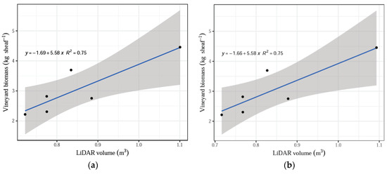 (a) LiDAR volume versus average value for vineyard biomass. (b) LiDAR volume without training structures versus average value for biomass.